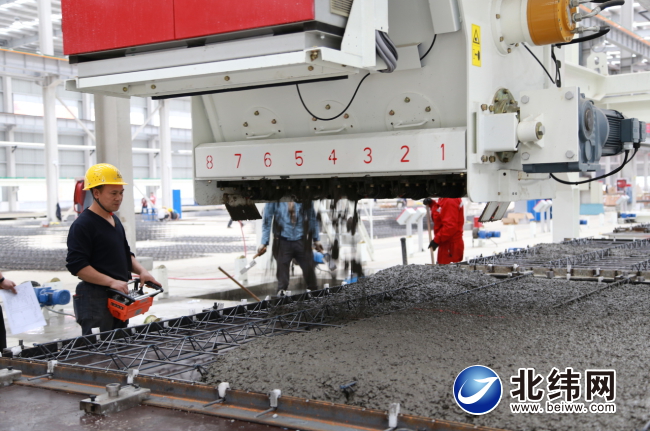 4月9日,雅安成建工業(yè)化建筑有限公司(以下簡稱雅安成建)PC生產(chǎn)線一片忙碌,工人與各類大型器械配合“親密無間”。生產(chǎn)流水線上,經(jīng)鋼筋綁扎、線管預(yù)留預(yù)埋、構(gòu)件混凝土澆筑等步驟后,一塊塊尚未晾干的疊合板便悄然成型!耙粔K疊合板從最初的拉伸鋼筋到最終的晾干僅需8個(gè)小時(shí)!毖虐渤山夹g(shù)負(fù)責(zé)人楊兵介紹,目前來自于成都周邊新建住宅的訂單讓他既幸福又痛苦,幸福是因?yàn)橛唵伪瑵M意味著發(fā)展?jié)摿薮,而痛苦是因(yàn)榕聼o法按時(shí)交付!耙?yàn)槟壳斑在試運(yùn)階段,無法開足馬力全線生產(chǎn)!