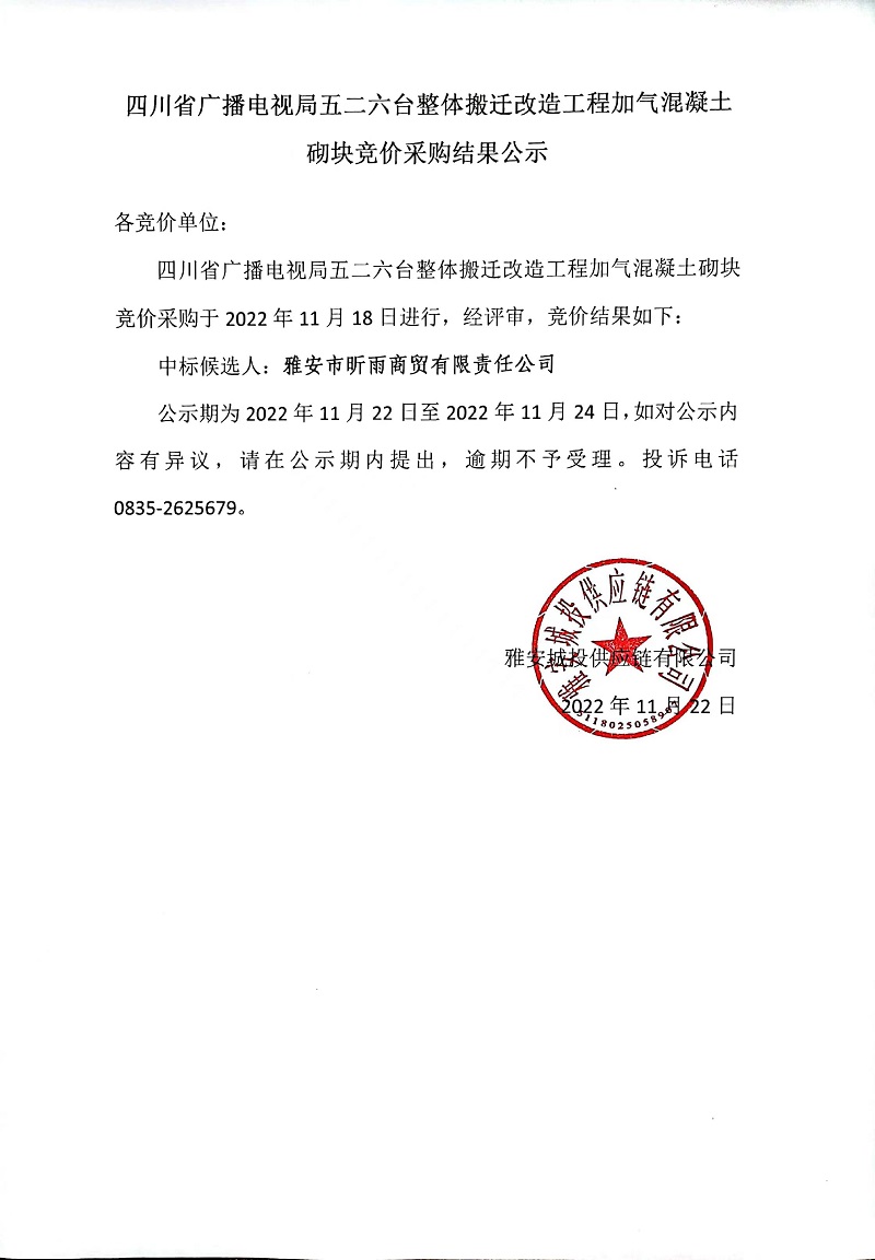 四川省廣播電視局五二六臺整體搬遷改造工程加氣混凝土砌塊競價采購結果公示