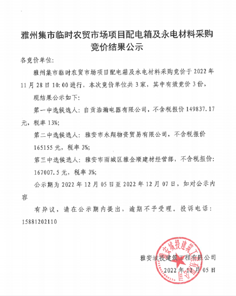 雅州集市臨時(shí)農(nóng)貿(mào)市場(chǎng)項(xiàng)目配電箱及永電材料采購(gòu)競(jìng)價(jià)結(jié)果公示