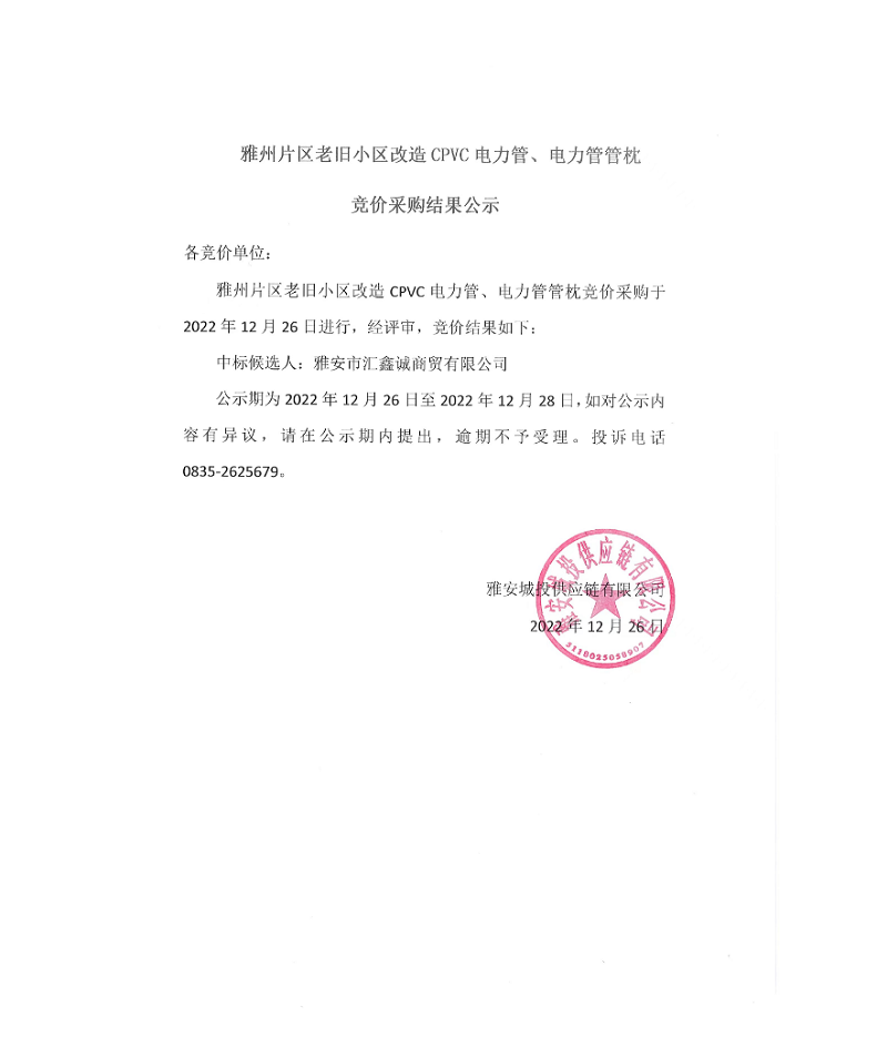 雅州片區(qū)老舊小區(qū)改造CPVC電力管、電力管管枕競價(jià)采購結(jié)果公示