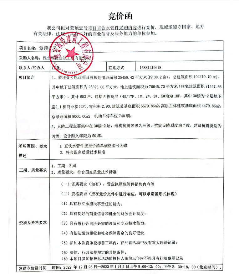 蒙頂壹號項(xiàng)目直飲水管件采購競價(jià)公告