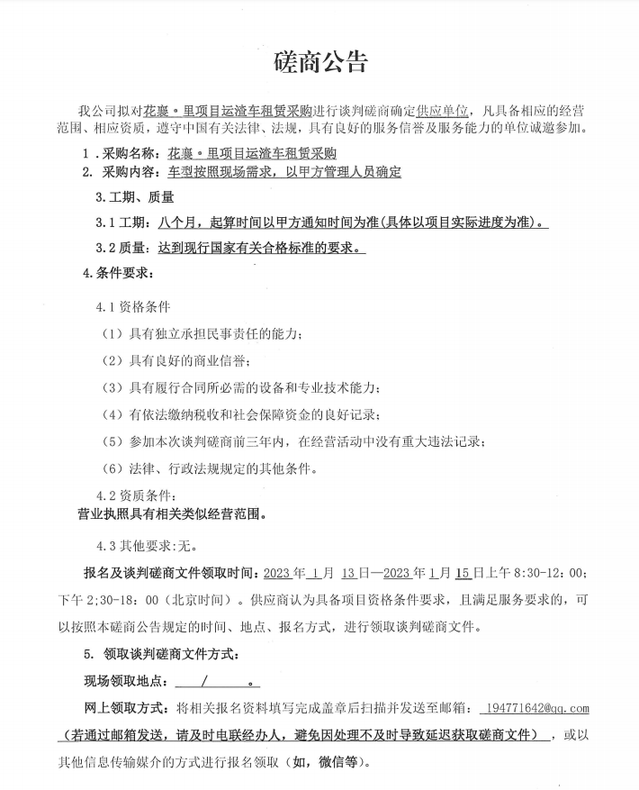 花襄·里項(xiàng)目運(yùn)渣車租賃采購談判磋商公告