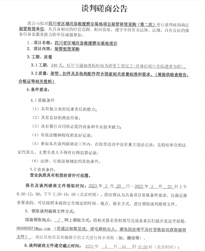 四川省區(qū)域應急救援雅安基地項目架管租賃采購(第二次)談判磋商公告
