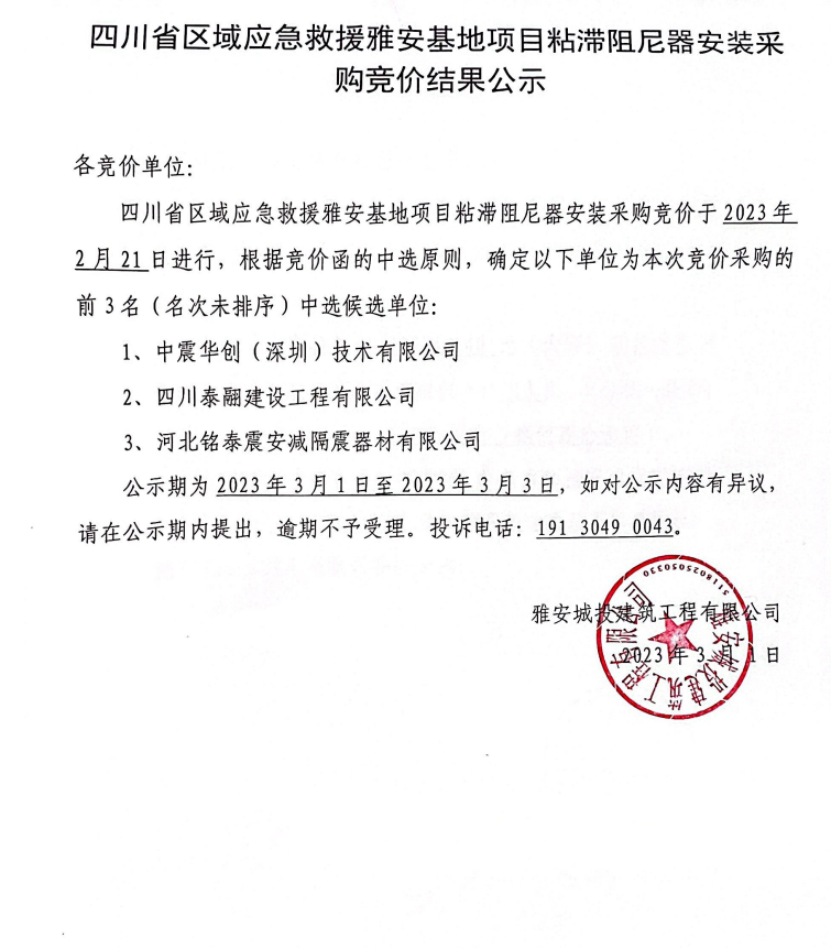 四川省區(qū)域應(yīng)急救援雅安基地項(xiàng)目粘滯阻尼器安裝采購競價結(jié)果公示