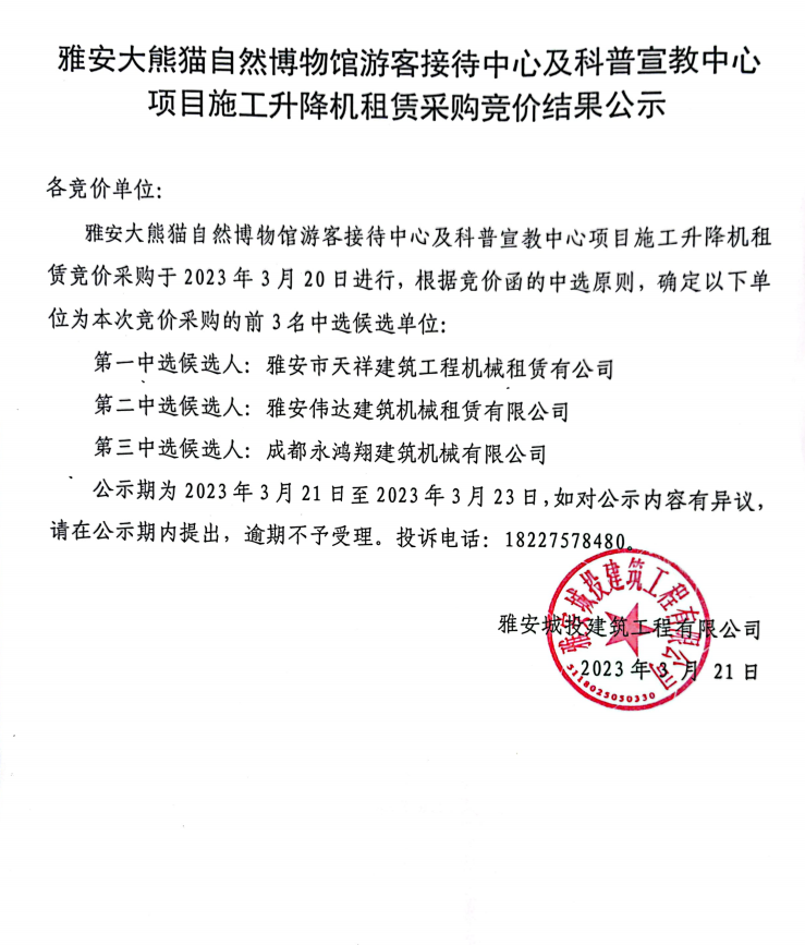 雅安大熊貓自然博物館游客接待中心及科普宣教中心項(xiàng)目施工升降機(jī)租賃采購(gòu)競(jìng)價(jià)結(jié)果公示