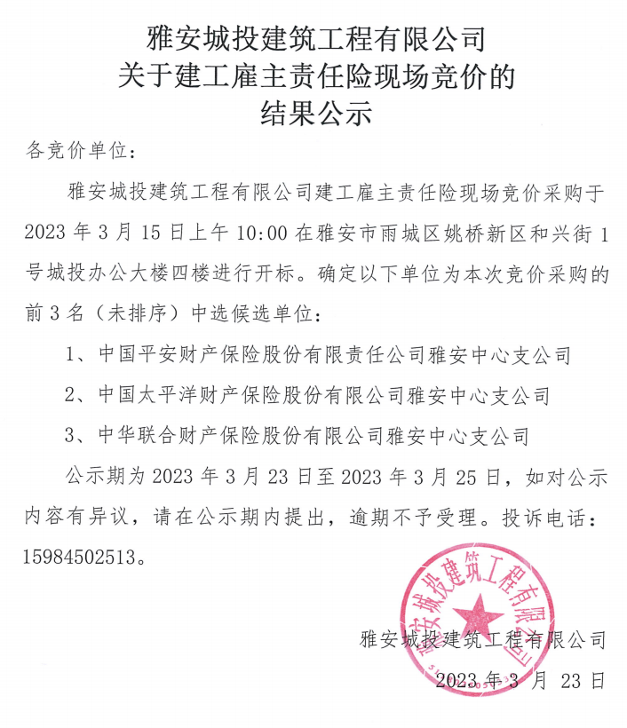 雅安城投建筑工程有限公司關(guān)于建工雇主責(zé)任險現(xiàn)場競價的結(jié)果公示
