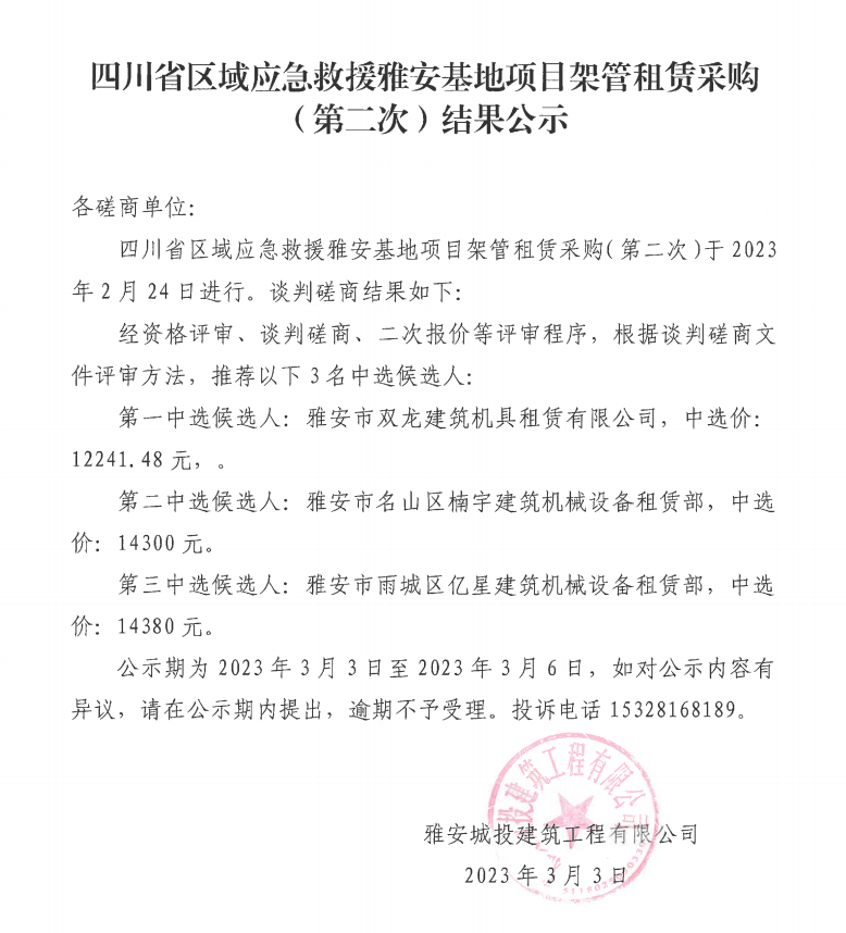 四川省區(qū)域應急救援雅安基地項目架管租賃采購(第二次)結果公示