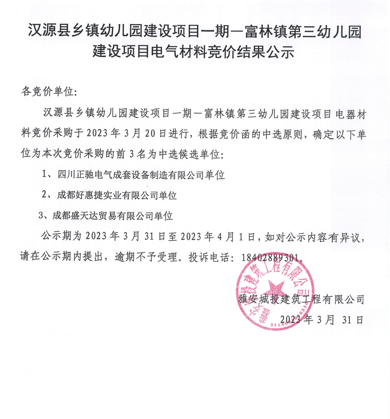 漢源縣鄉(xiāng)鎮(zhèn)幼兒園建設(shè)項(xiàng)目一期一富林鎮(zhèn)第三幼兒園建設(shè)項(xiàng)目電氣材料競價(jià)結(jié)果公示