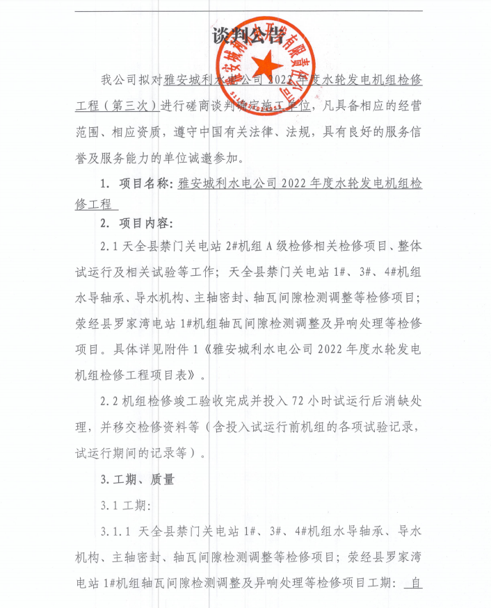 雅安城利水電公司2022年度水輪發(fā)電機組檢修工程(第三次)磋商談判公告