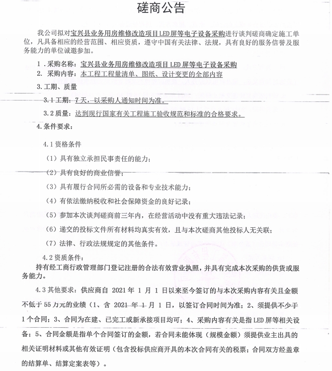 寶興縣業(yè)務(wù)用房維修改造項(xiàng)目LED屏等電子設(shè)備采購(gòu)磋商公告