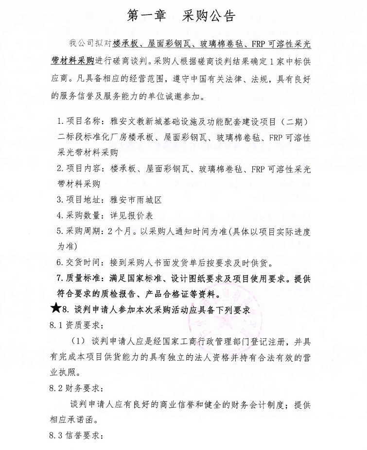 雅安文教新城基礎(chǔ)設(shè)施及功能配套建設(shè)項(xiàng)目(二期)二標(biāo)段標(biāo)準(zhǔn)化廠(chǎng)房樓承板、屋面彩鋼瓦、玻璃棉卷氈、FRP可溶性采光帶材料采購(gòu)公告