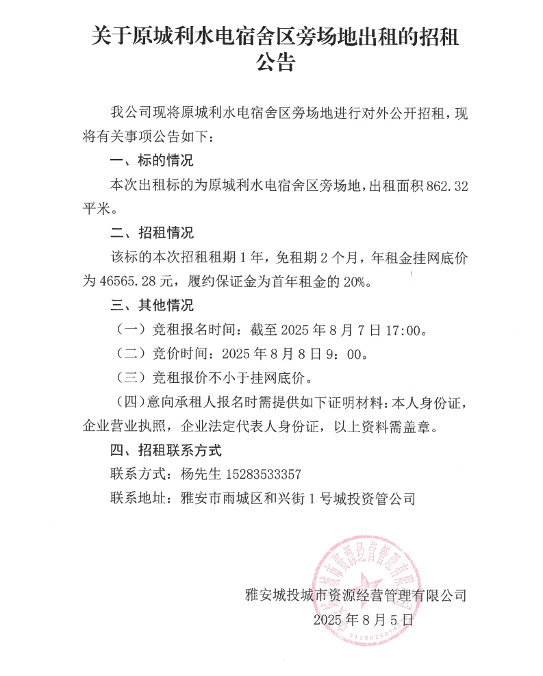 關于原城利水電宿舍區(qū)旁場地出租的招租公告