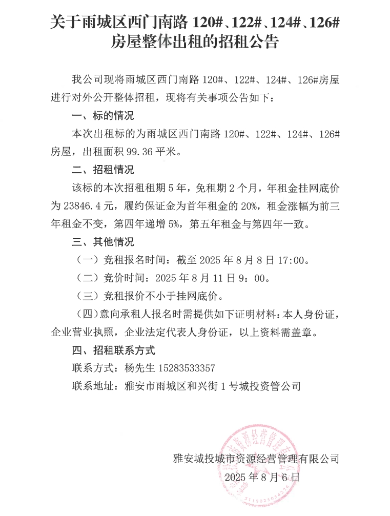 關于雨城區(qū)西門南路120#、122#、124#、126#房屋整體出租的招租公告