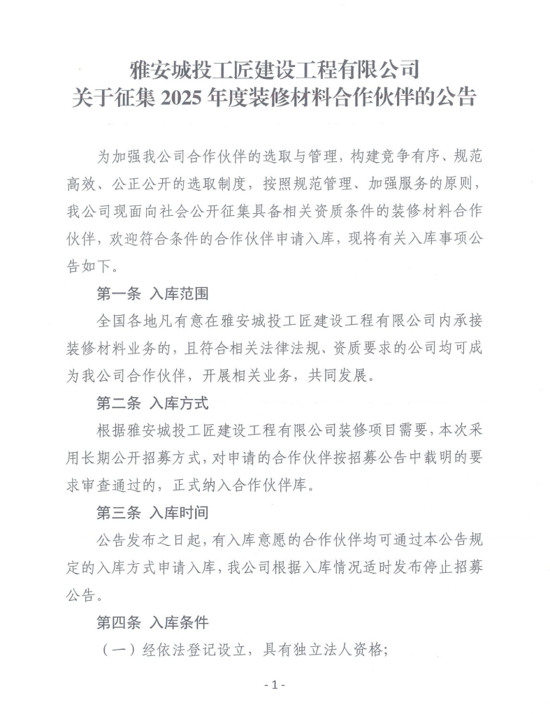 關(guān)于征集2025年度裝修材料合作伙伴的公告
