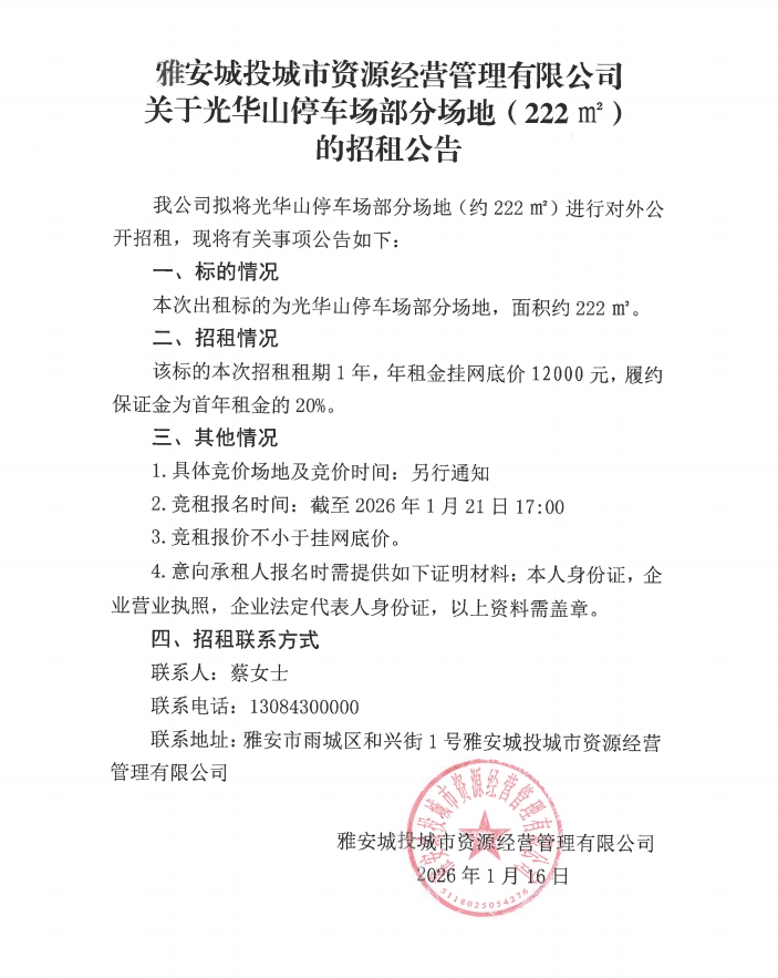 雅安城投城市資源經(jīng)營(yíng)管理有限公司關(guān)于光華山停車場(chǎng)部分場(chǎng)地(222㎡)的招租公告