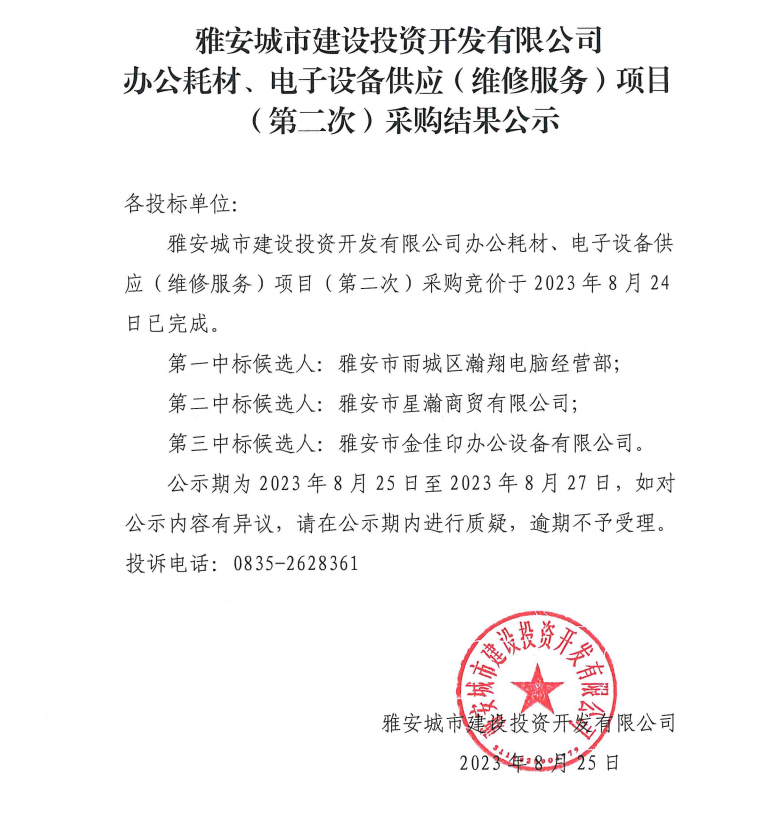 雅安城市建設(shè)投資開發(fā)有限公司辦公耗材、電子設(shè)備供應(yīng)(維修服務(wù))項(xiàng)目(第二次)采購結(jié)果公示