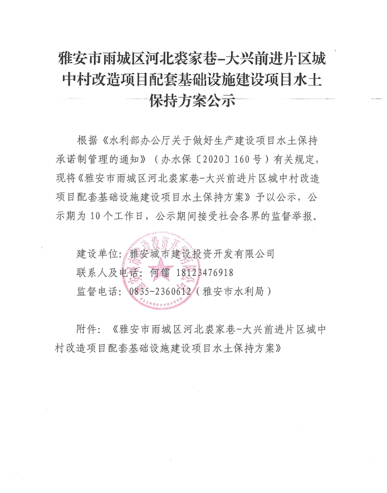 雅安市雨城區(qū)河北裘家巷-大興前進(jìn)片區(qū)城中村改造項(xiàng)目配套基礎(chǔ)設(shè)施建設(shè)項(xiàng)目水土保持方案公示