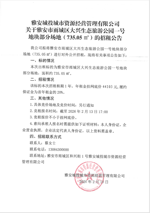 雅安城投城市資源經(jīng)營管理有限公司關(guān)于雅安市雨城區(qū)大興生態(tài)旅游公園一號地塊部分場地(735.05㎡)的招租公告