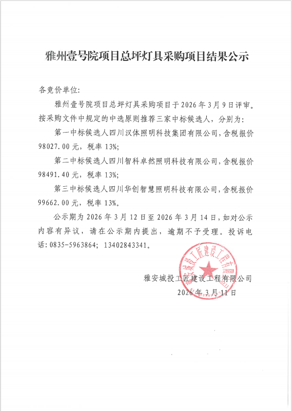 雅州壹號院項目總坪燈具采購項目結(jié)果公示