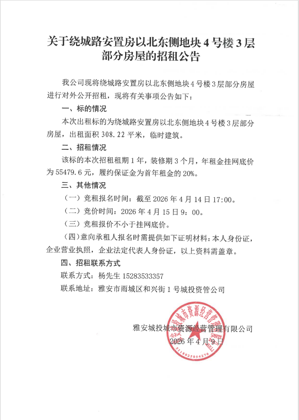 關于繞城路安置房以北東側地塊4號樓3層部分房屋的招租公告