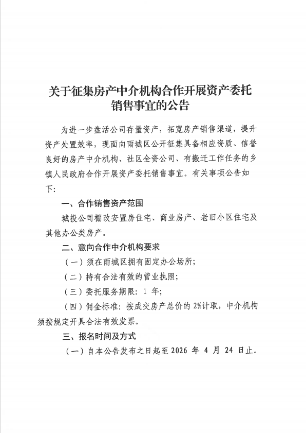 關(guān)于征集房產(chǎn)中介機構(gòu)合作開展資產(chǎn)委托銷售事宜的公告